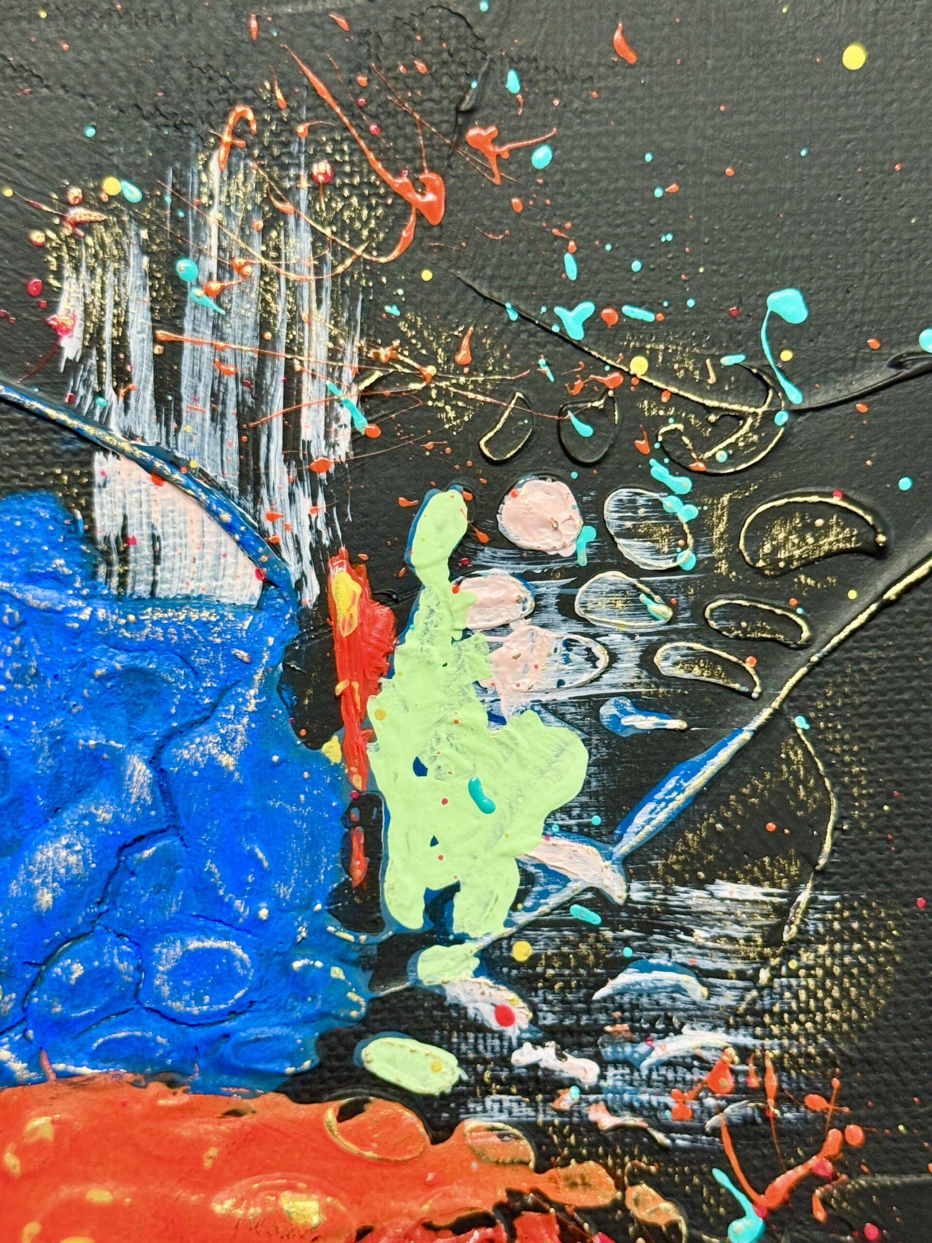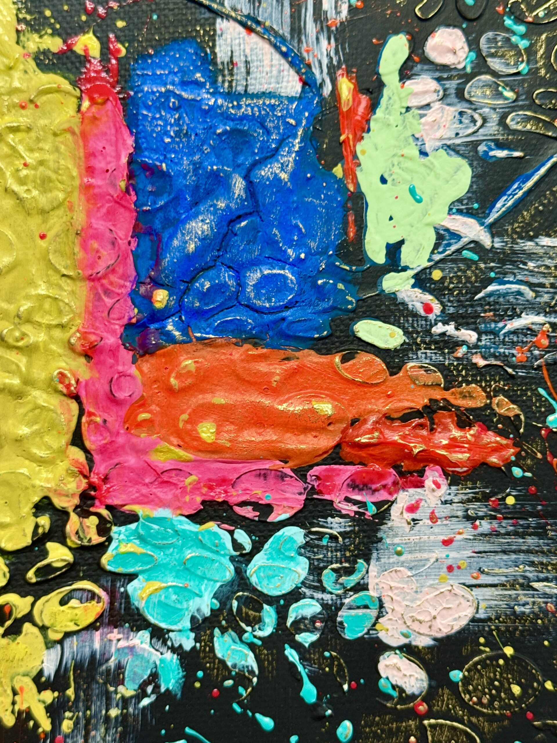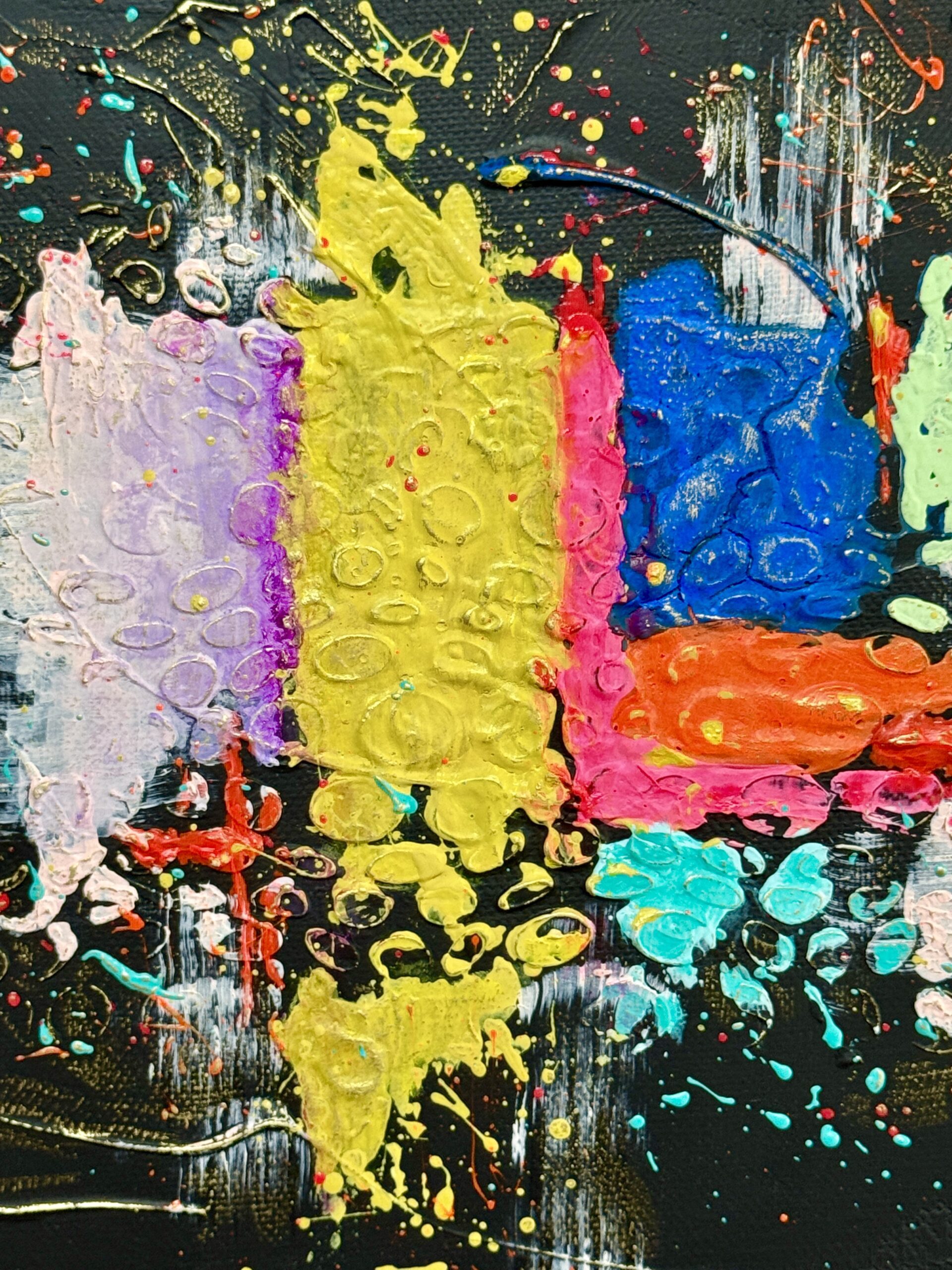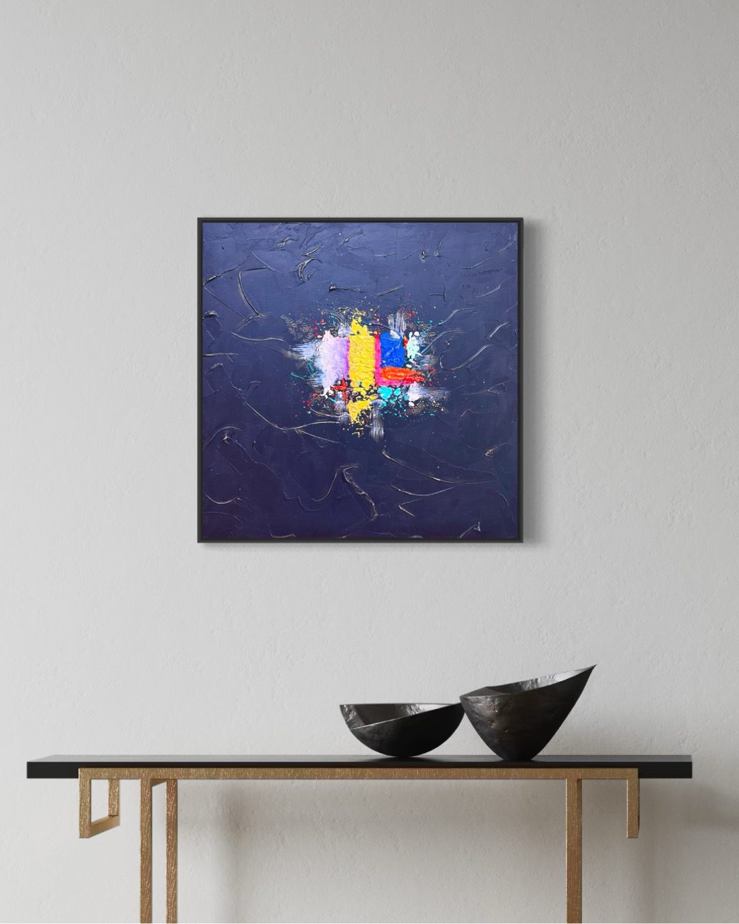 Описание – Абстракцията върху черен фон концентрира енергията на мисълта и чувството – като светлина, родена от тъмнината на съзнанието. Цветовете се сблъскват и преливат в едно, създавайки усещане за вътрешна сила, трансформация и ново начало. Творбата е отражение на онзи момент, в който хаосът се превръща в яснота, а енергията – в съзидание. Tази картина може да се допълни с „Експлозия на съзнанието“, с двете по-малки платна, които разгръщат фрагменти „Експлозия на съзнанието I“ или с „Експлозия на съзнанието III“. Разгледайте картините в галерия и направете прекрасно допълнение.Детайли