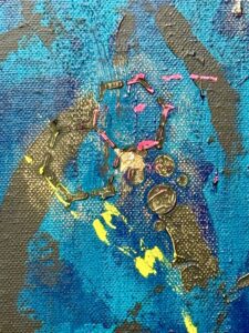 Техника: акрилна и смесена техника върху платно – акрилни бои, структурни пасти, златен шлакметал