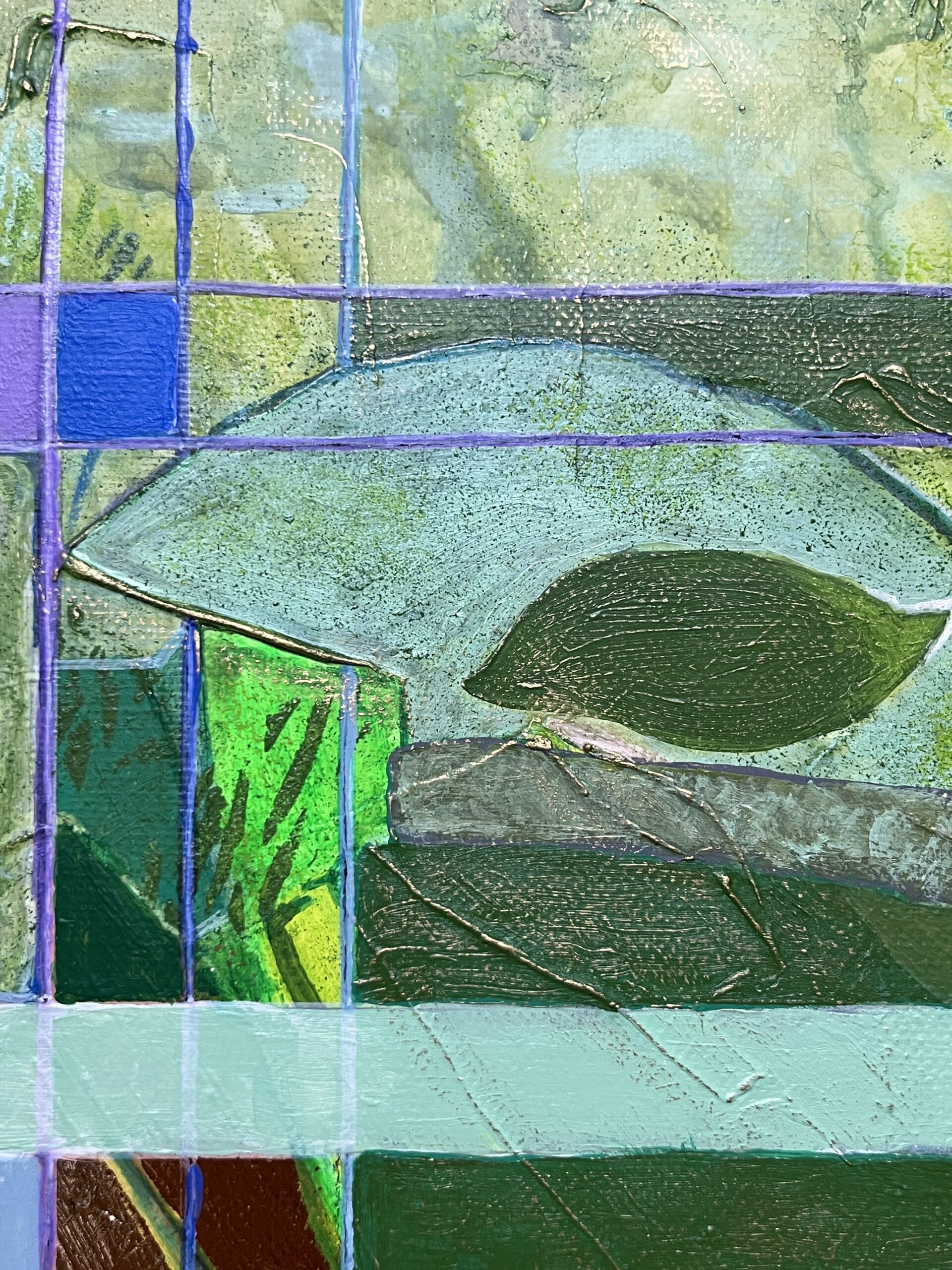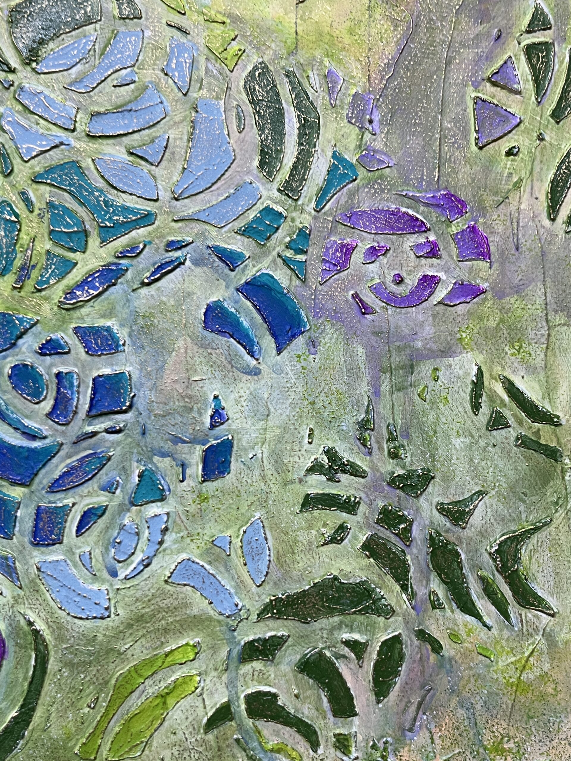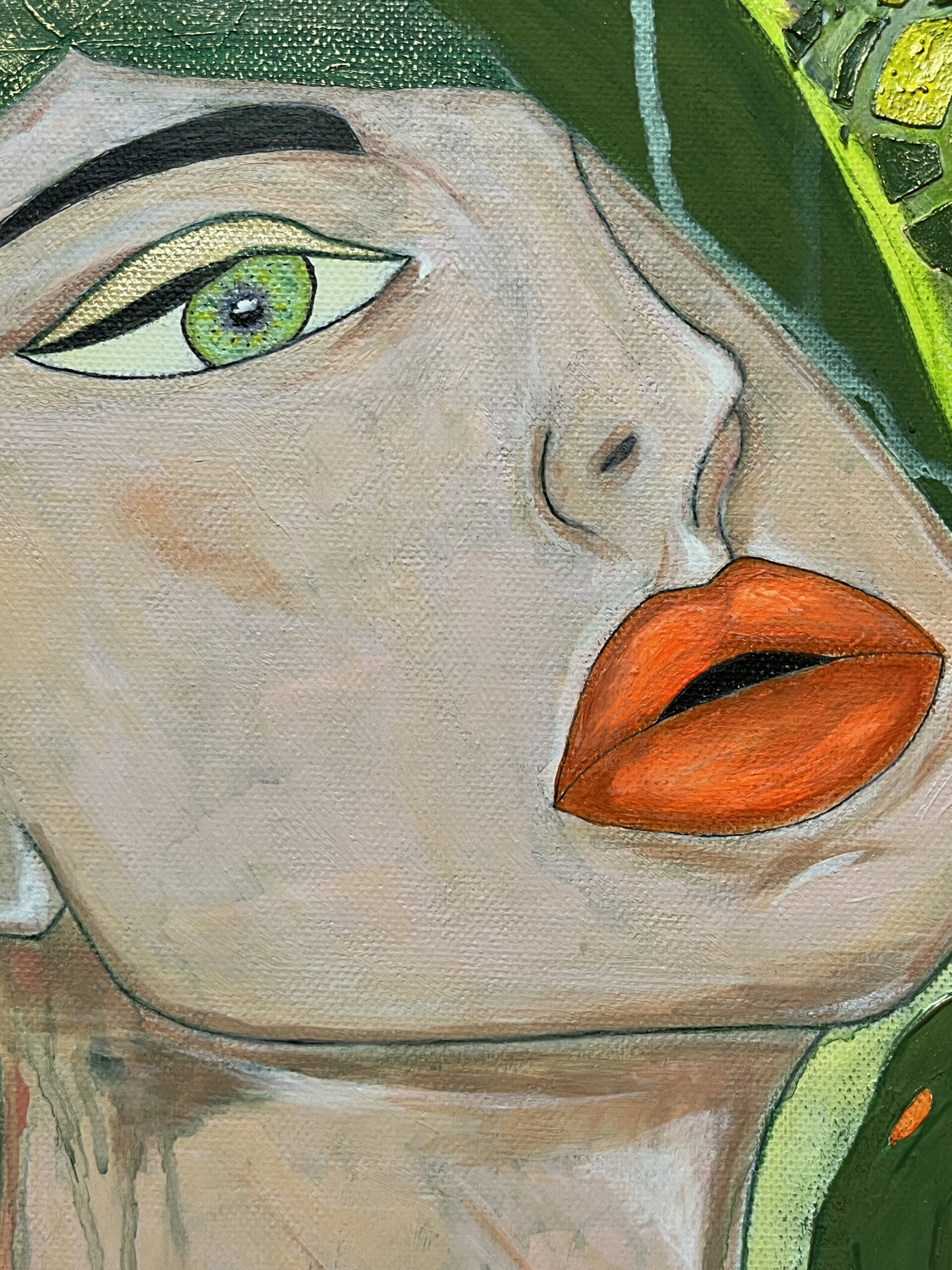 Техника: акрилна и смесена техника върху платно – акрилни бои, структурни пасти, златен шлакметал